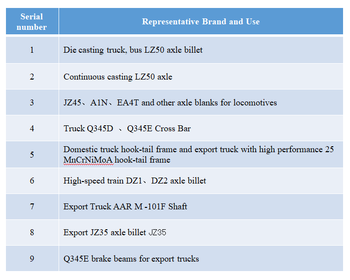 The main products include continuous casting LZ50 axle billet, LZ45CrV axle billet, export truck AAR M-101 Class F axle billet, locomotive JZ45、A1N、EA4T axle billet, domestic large axle heavy truck new brake beam Q460E、 export truck brake beam Q345E, domestic truck hook tail frame and export truck with high performance hook tail frame 25MnCrNiMoA and so on.