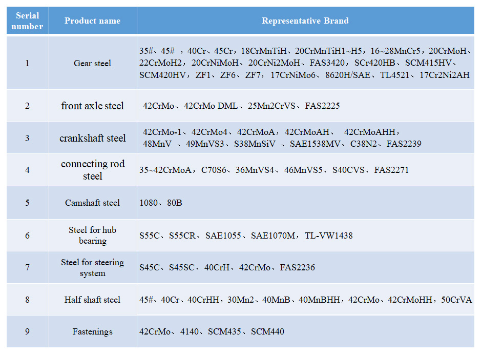 According to the requirements of customers, we can produce automobile steel products with low Oxygen , low Titanium , high purity, narrow hardenability belt, fine grain size, with the size range of Φ10mm~ Φ250 mm, covering CrMnTi, MnCr, CrMo, CrNiMo series of gear steel, non quenched and tempered steel represented by 25Mn2CrVB front axle steel, C38N2 crankshaft steel, C70S6, 46MnVS5 connecting rod steel, as well as various quenched and tempered shafts, transmission parts and other automobile parts Steel.
